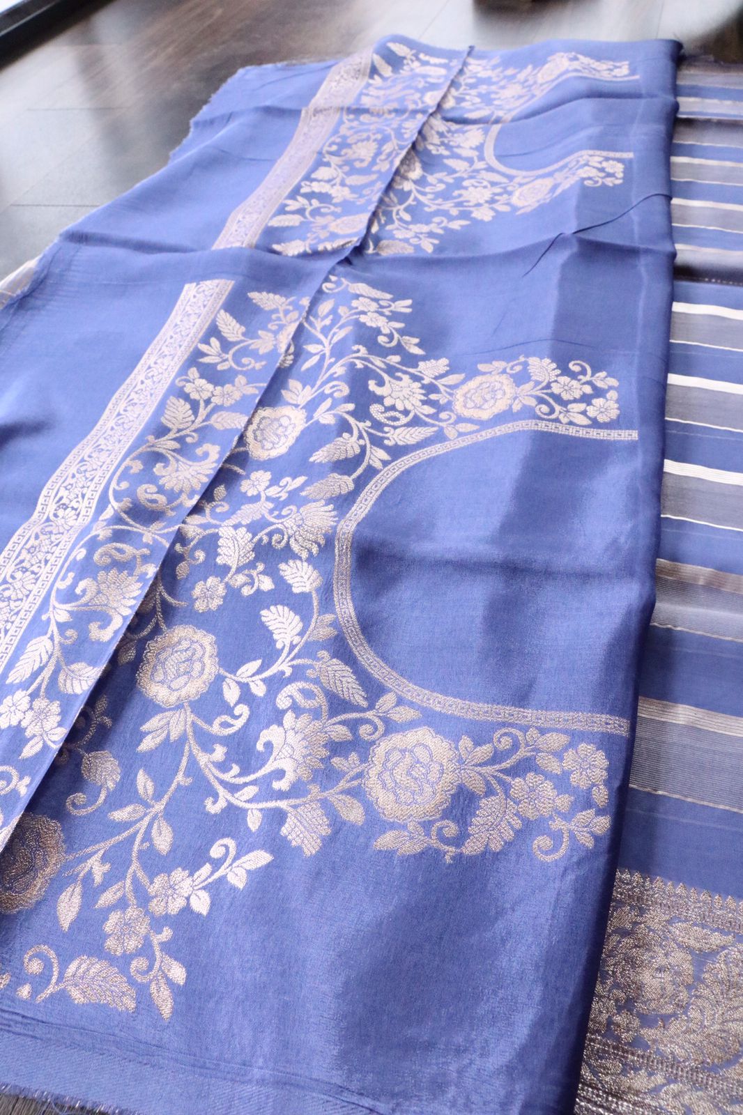 Premium banarasi georgette organza sarees with stripe pattern in antique zari .