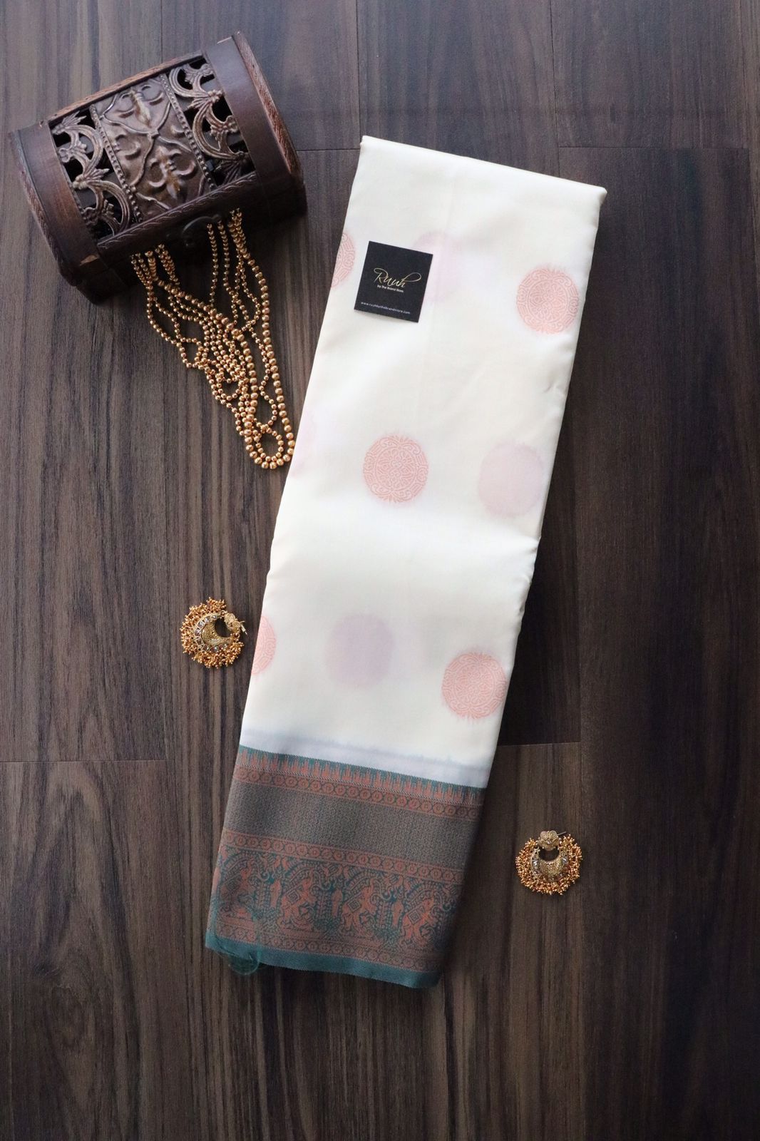 Colour : Creamish Body with woven buttas , Green border pallu and woven design blouse